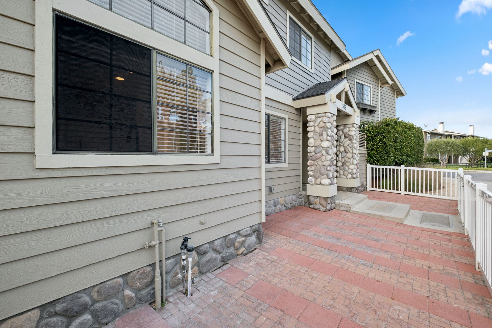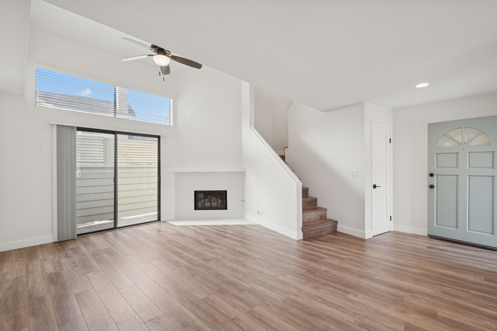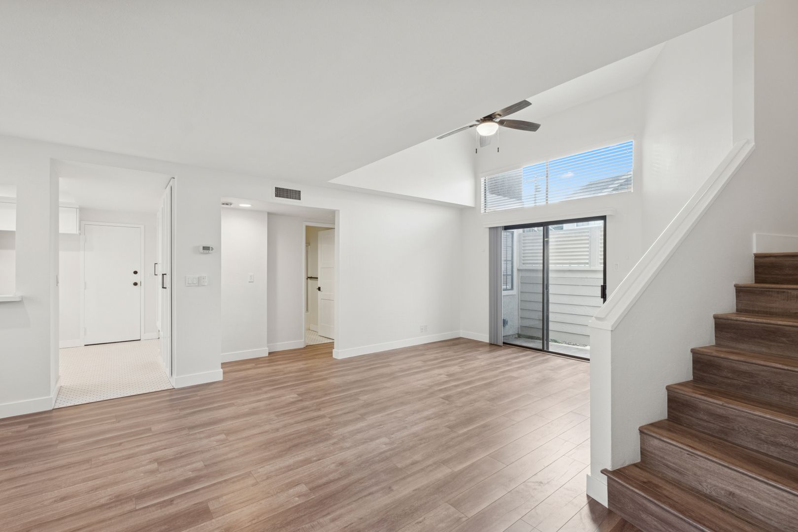 The bright living room boasts vaulted ceilings, a cozy fireplace, and access to a large front patio—perfect for relaxing or entertaining. The kitchen showcases white cabinetry, granite countertops, and brand-new stainless steel appliances. Tile and laminate flooring run throughout the home, creating a clean, modern aesthetic.