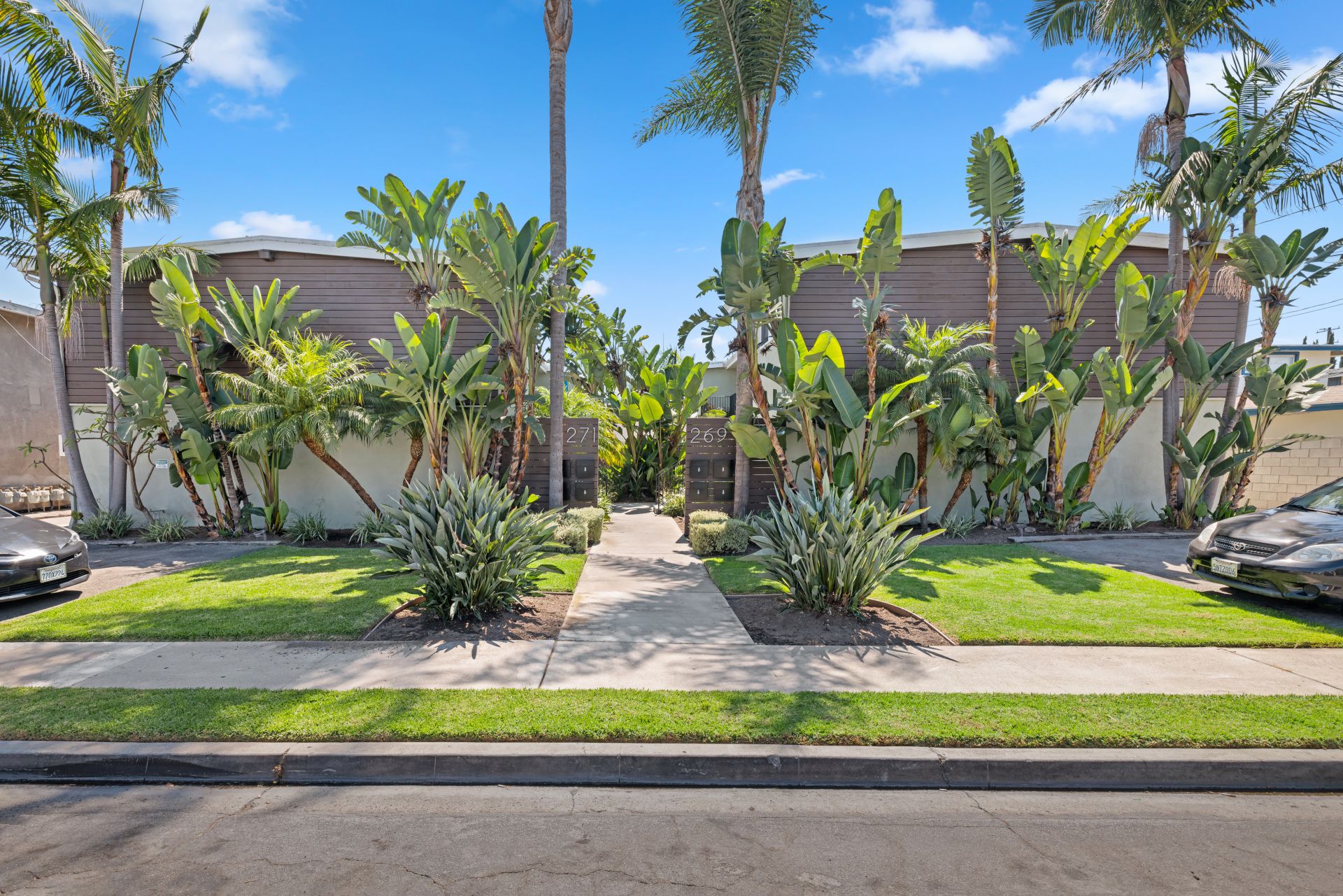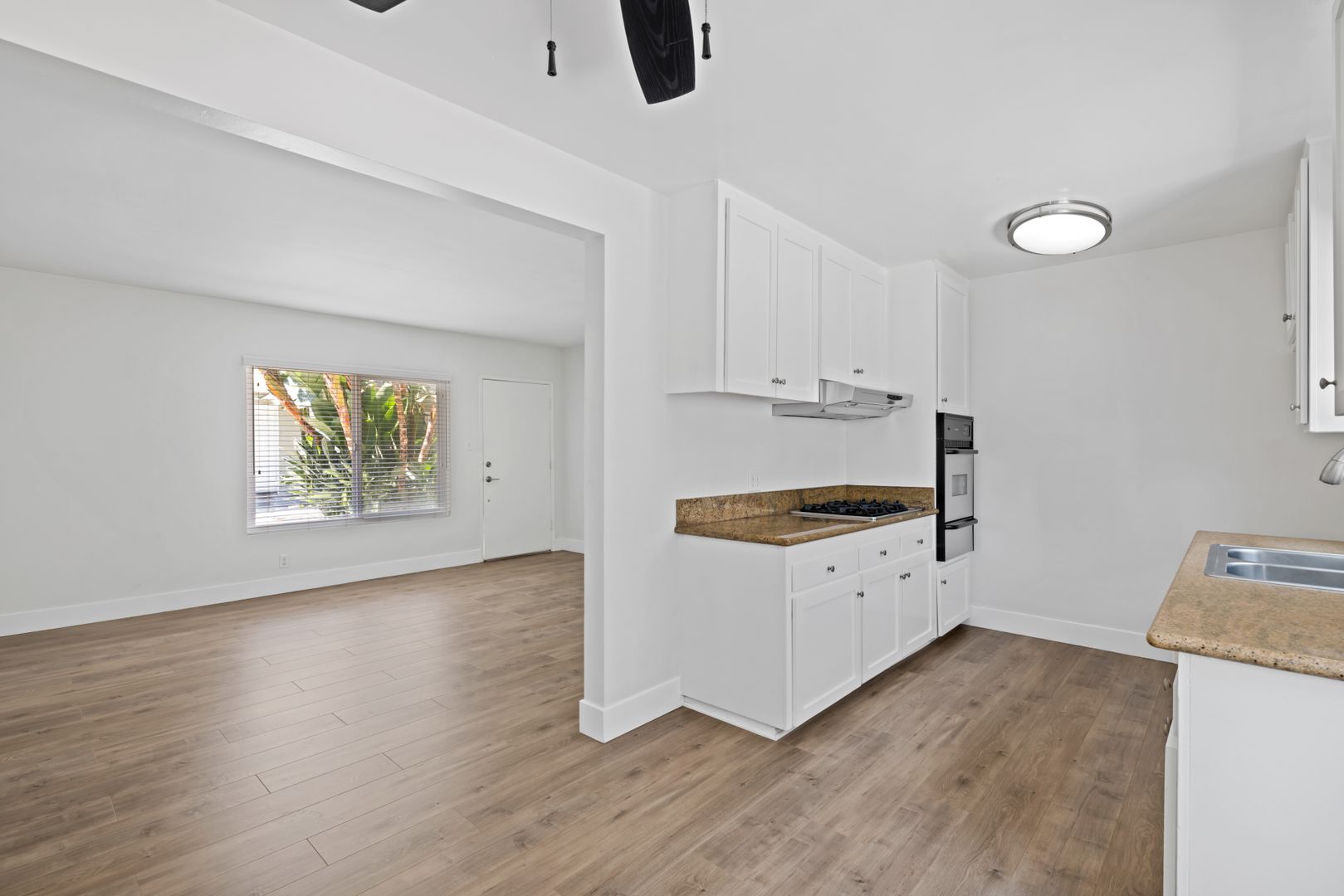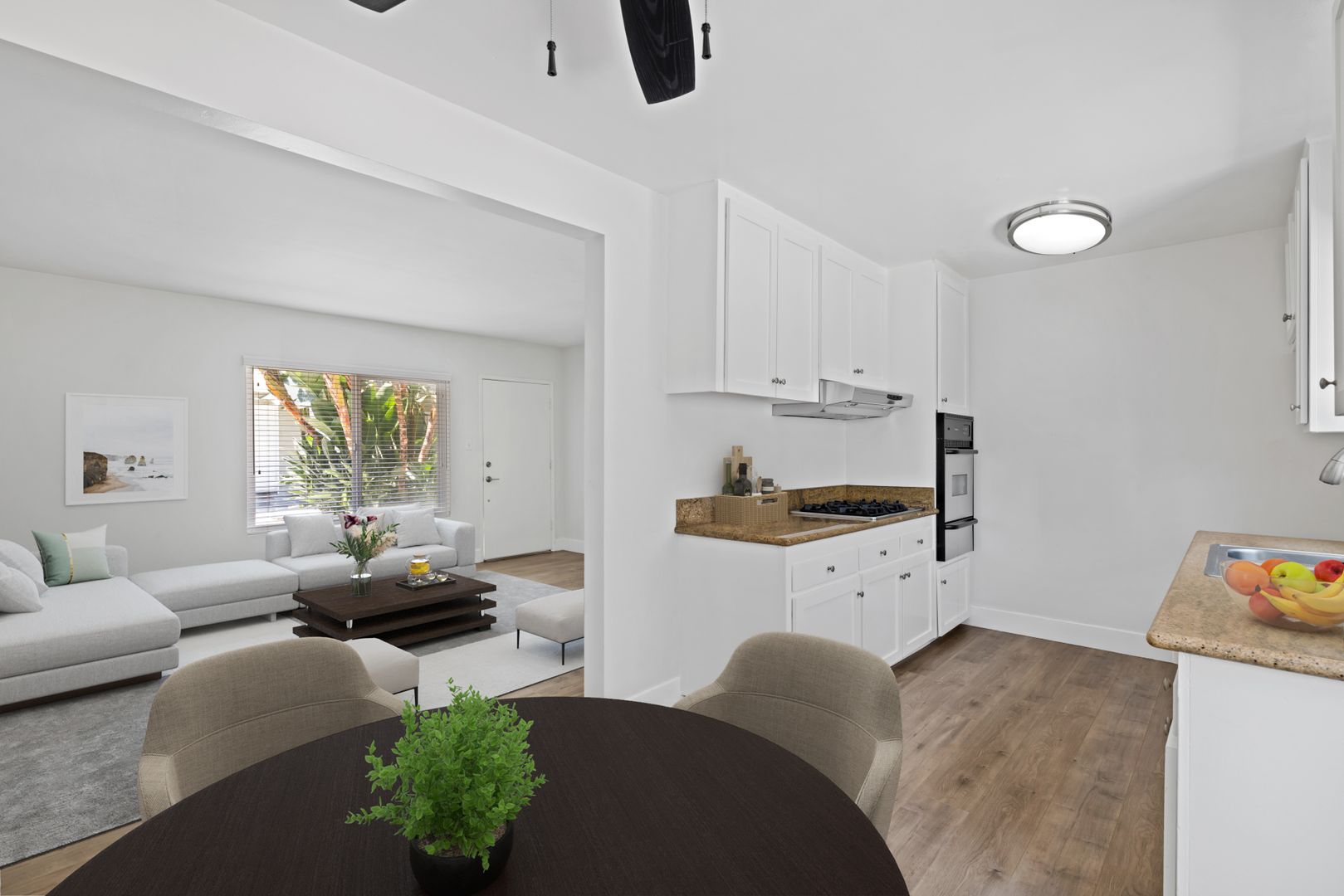 With modern architectural features, this light-filled ground-level home offers a seamless flow from room to room. The residence features a spacious living room, a separate dining area, and two generously sized bedrooms with mirrored wardrobe doors. Additional highlights include laminate flooring, granite countertops, a stainless steel gas range, built-in oven, and contemporary fixtures throughout. The lush landscaping showcases palm trees and birds of paradise, creating a serene setting. The home includes one assigned carport space with storage and access to a community laundry facility. Enjoy Eastside Costa Mesa living at its best, with convenient access to world-famous beaches, dining, and shopping.