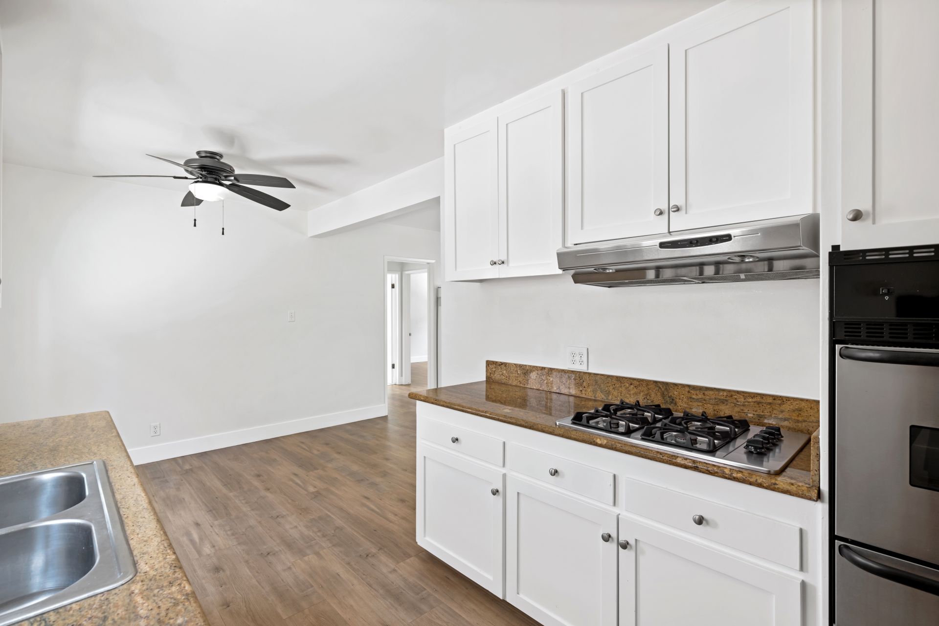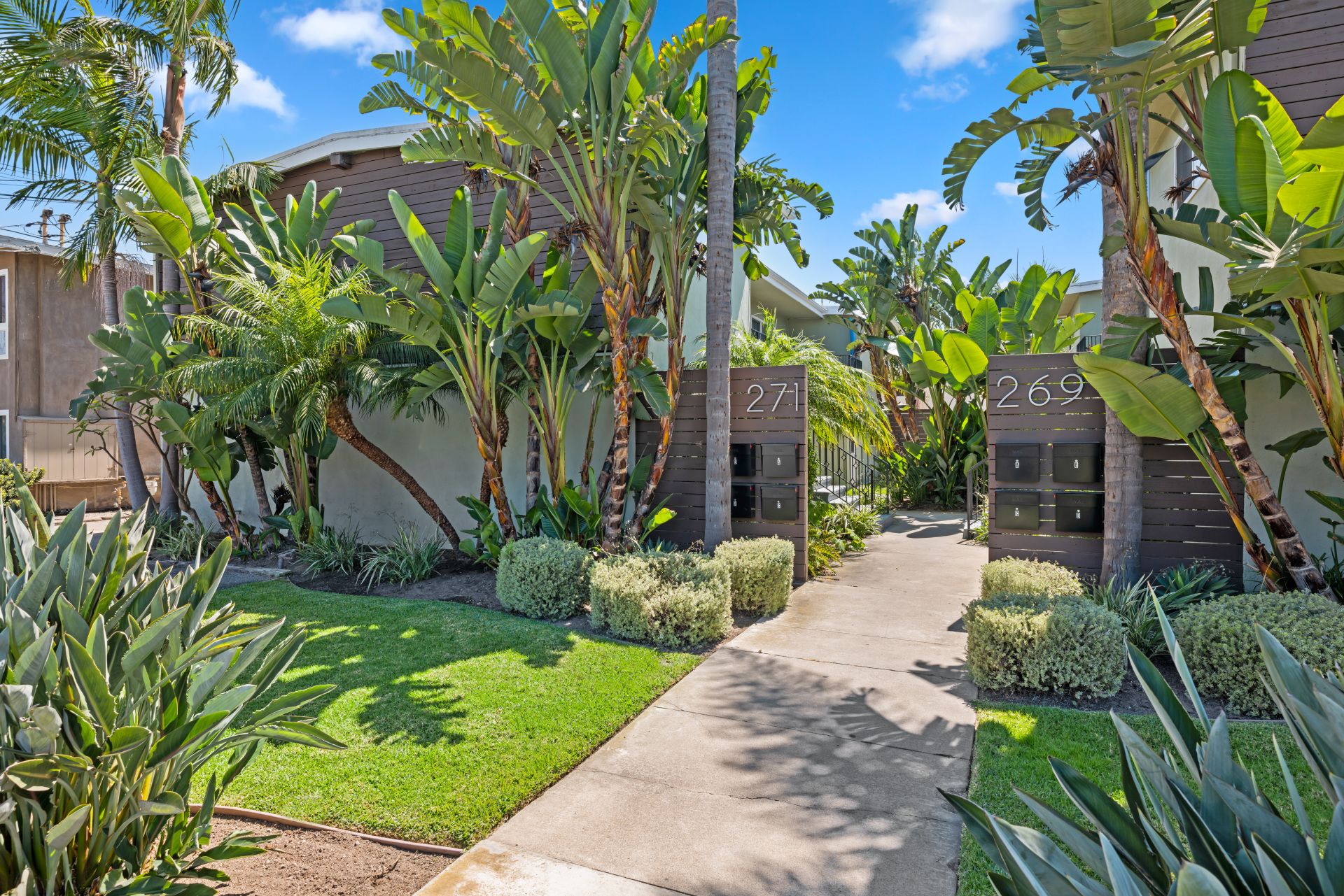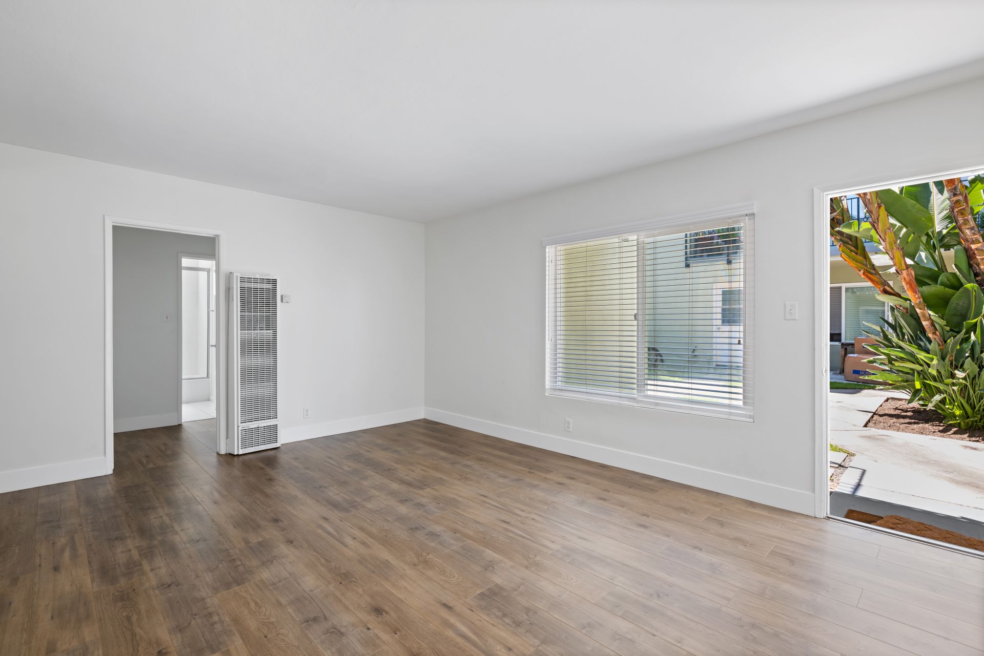 With modern architectural features, this light-filled ground-level home offers a seamless flow from room to room. The residence features a spacious living room, a separate dining area, and two generously sized bedrooms with mirrored wardrobe doors. Additional highlights include laminate flooring, granite countertops, a stainless steel gas range, built-in oven, and contemporary fixtures throughout. The lush landscaping showcases palm trees and birds of paradise, creating a serene setting. The home includes one assigned carport space with storage and access to a community laundry facility. Enjoy Eastside Costa Mesa living at its best, with convenient access to world-famous beaches, dining, and shopping.